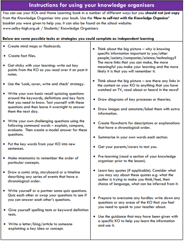 You may use your knowledge organiser to support your independent study by creating flashcards, self-quizzing, memory mnemonics (using the first letter or acronym to easily remember information), creating a mind map, blanking out the organiser and writing down how much you can remember, constructing a diagram from memory or elaboration (say the information aloud to remember it or cover the key term and describe it aloud).